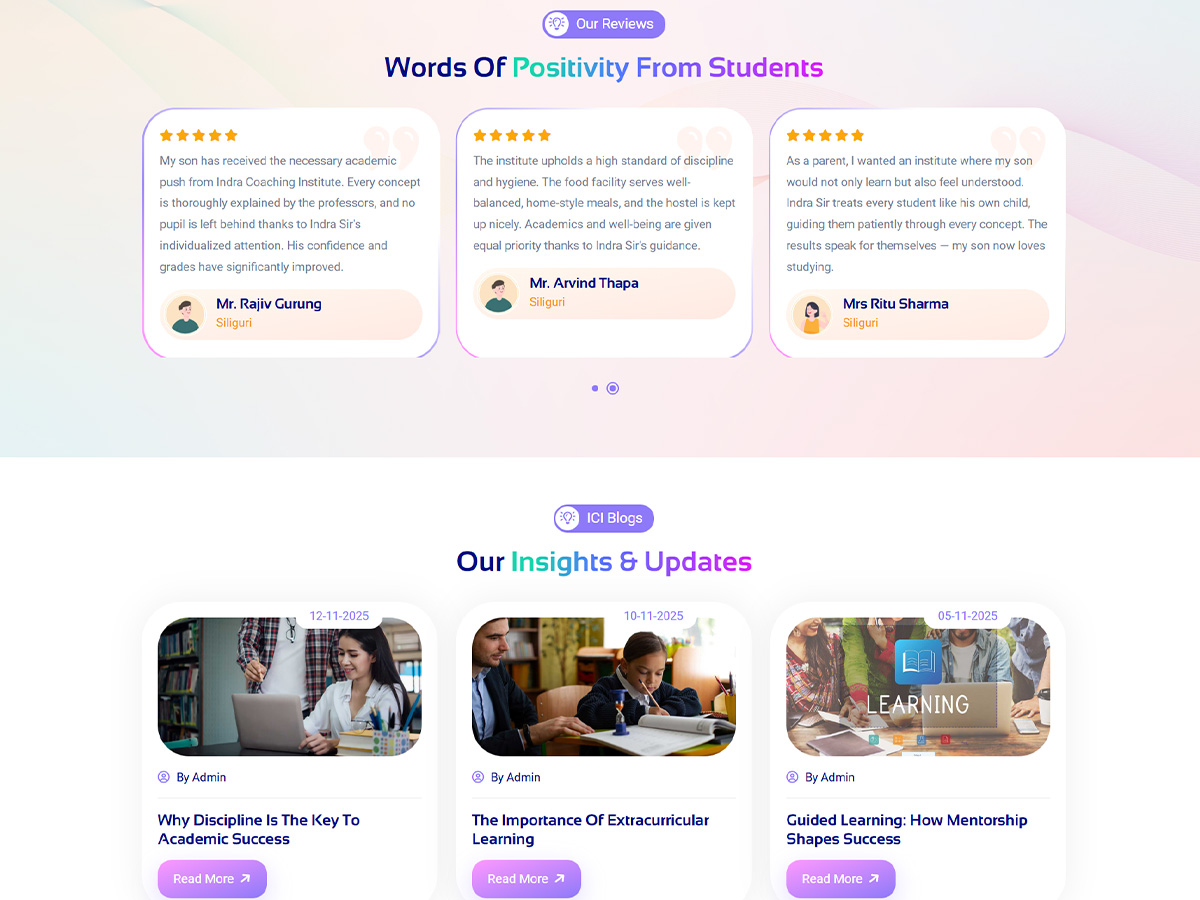 The finished website is a digital representation of Indra Coaching Institute's dedication to high-quality instruction and student achievement. The platform combines a clear content structure, a disciplined academic design, and easy-to-use navigation. The website serves as an effective registration and branding tool in addition to being an online presence, establishing Indra Coaching Institute as a trustworthy academic environment.