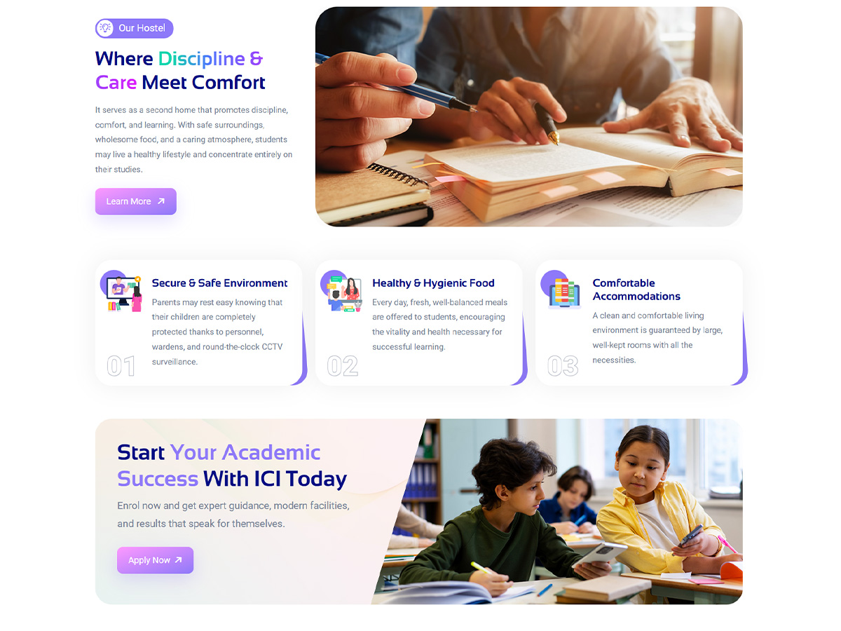 We created an elegant, education-focused website with well-balanced style, layouts that emphasize clarity, motivation, focus, and trust. The interface was thoughtfully designed to make it easy for users to navigate courses, faculty strengths, and enrolment pathways, guaranteeing a seamless and educational experience.